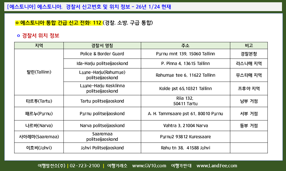 [에스토니아] 에스토니아, 경찰서 신고번호 및 위치 정보 - 26년 1/24 현재