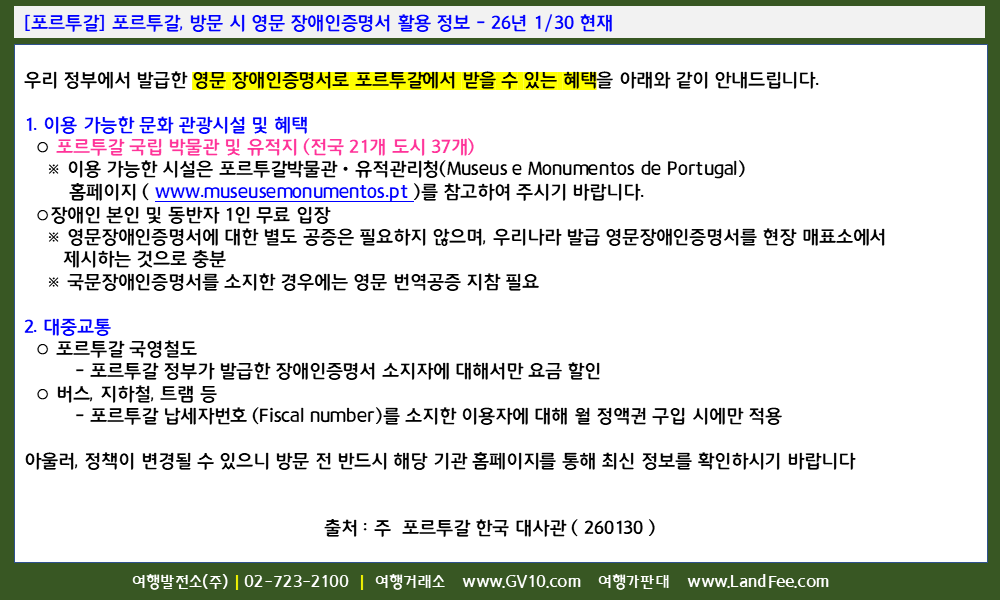 [포르투갈] 포르투갈, 방문 시 영문 장애인증명서 활용 정보 - 26년 1/30 현재