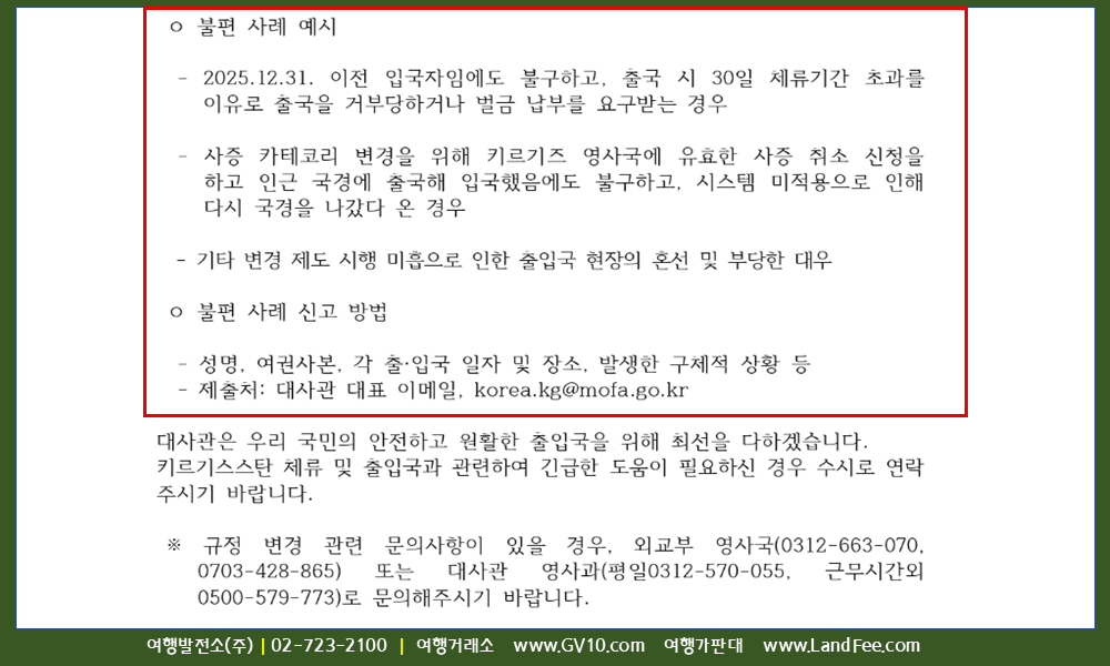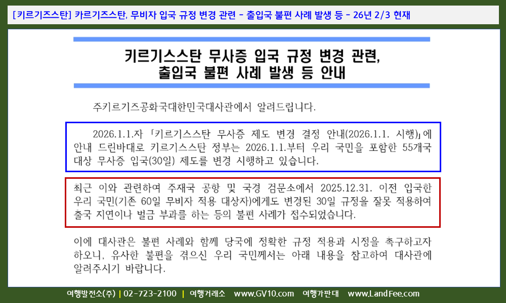 [키르기즈스탄] 카르기즈스탄, 무비자 입국 규정 변경 관련 - 출입국 불편 사례 발생 등 - 26년 2/3 현재