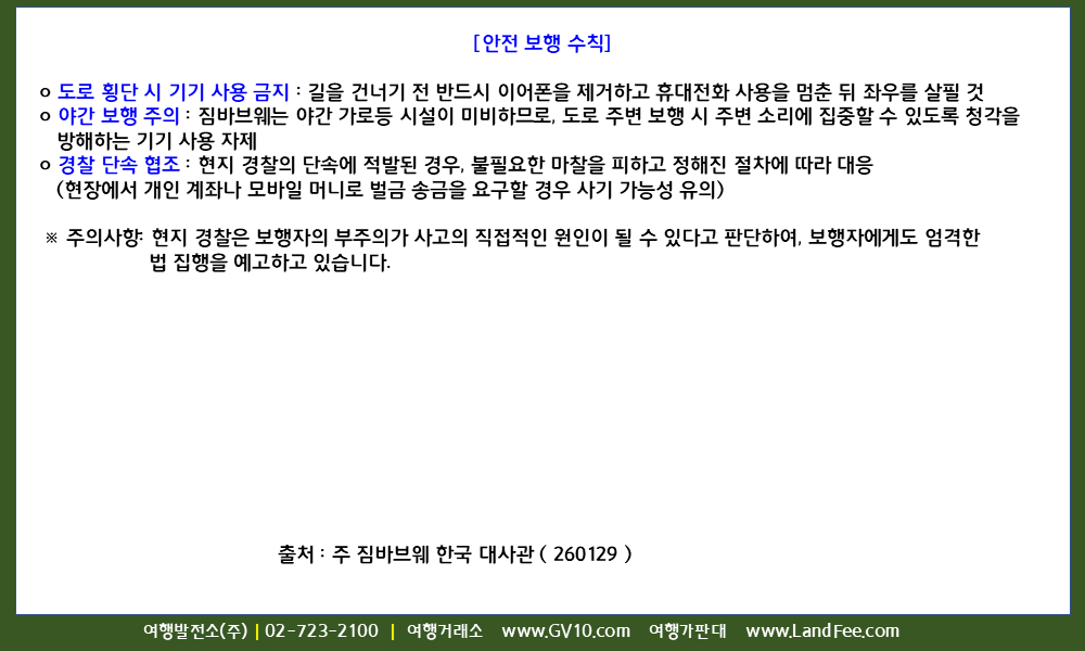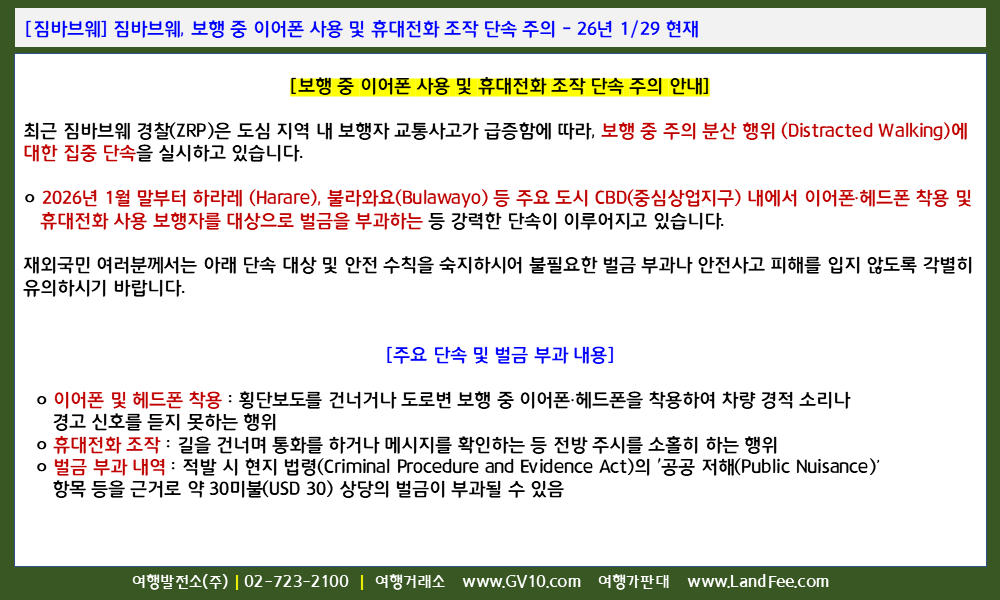 [짐바브웨] 짐바브웨, 보행 중 이어폰 사용 및 휴대전화 조작 단속 주의 - 26년 1/29 현재