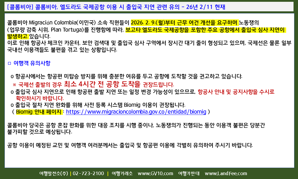 [콜롬비아] 콜롬비아, 엘도라도 국제공항 이용 시 출입국 지연 관련 유의 - 26년 2/11 현재