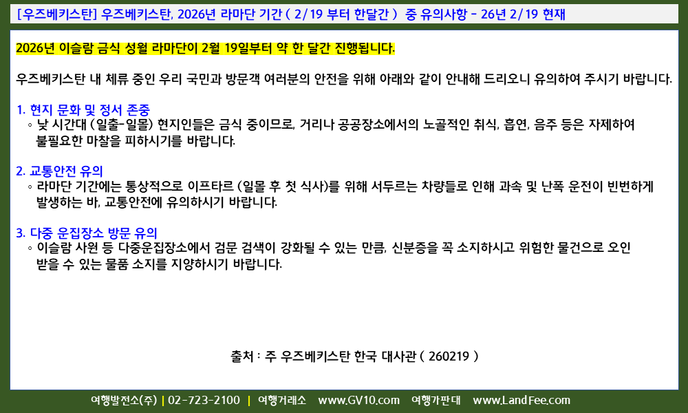 [우즈베키스탄] 우즈베키스탄, 2026년 라마단 기간 ( 2/19 부터 한달간 ) 중 유의사항 - 26년 2/19 현재