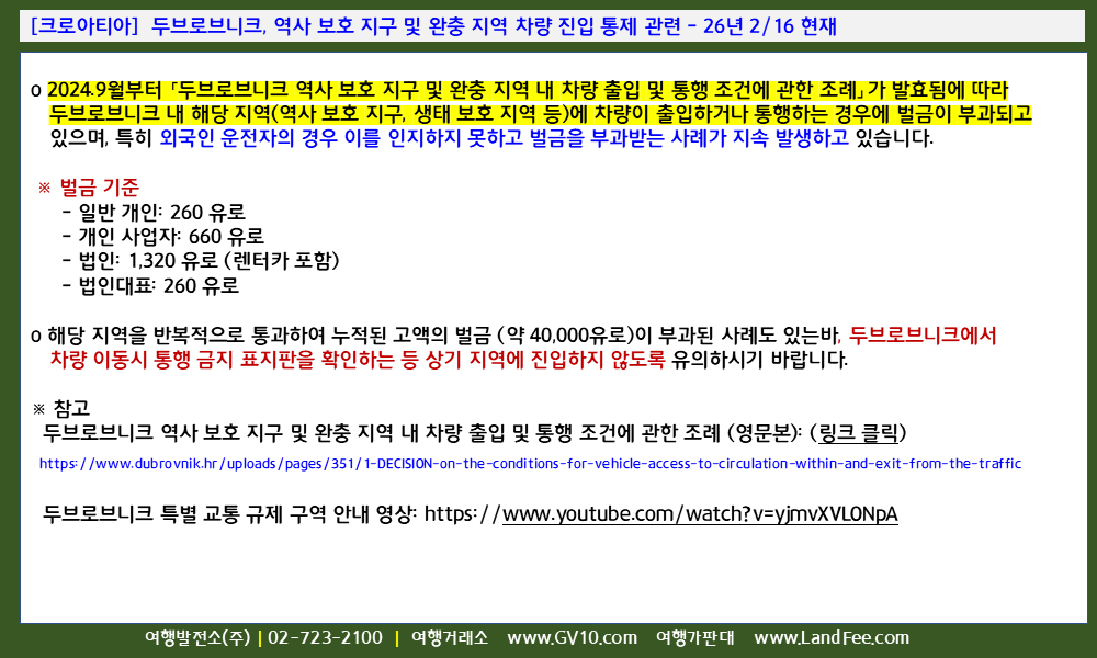 [크로아티아] 두브로브니크, 역사 보호 지구 및 완충 지역 차량 진입 통제 관련 - 26년 2/16 현재
