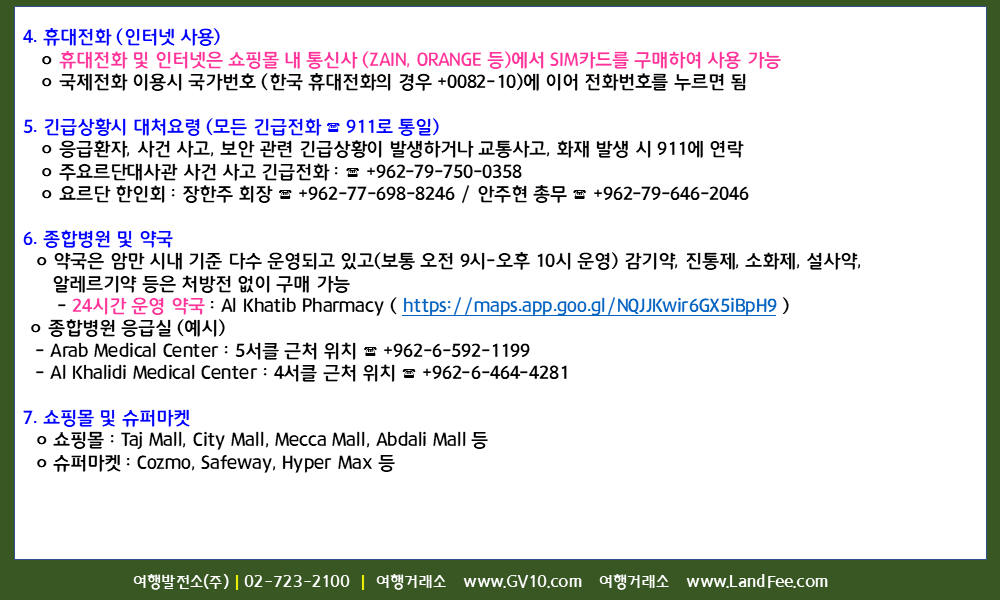 - 드림게스트하우스 : ☎ +962-79-980-2293 (현금 결제, https://maps.app.goo.gl/1GR4jf8hdTgf5JRA6 )