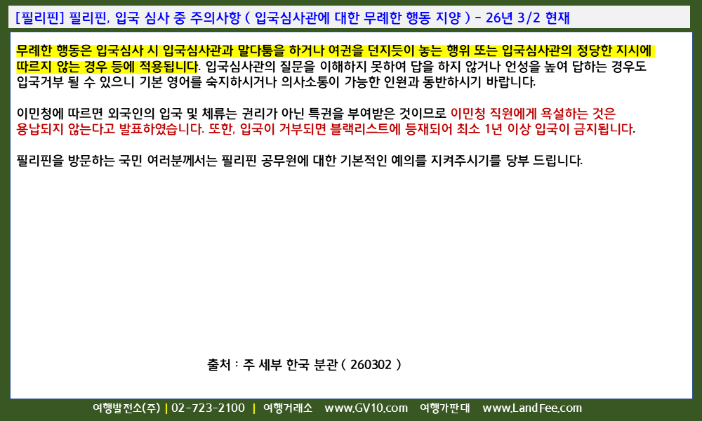 [필리핀] 필리핀, 입국 심사 중 주의사항 ( 입국심사관에 대한 무례한 행동 지양 ) - 26년 3/2 현재