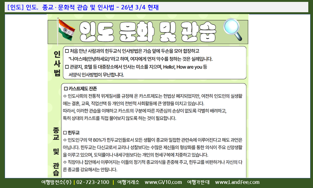 [인도] 인도, 종교ㆍ문화적 관습 및 인사법 - 26년 3/4 현재