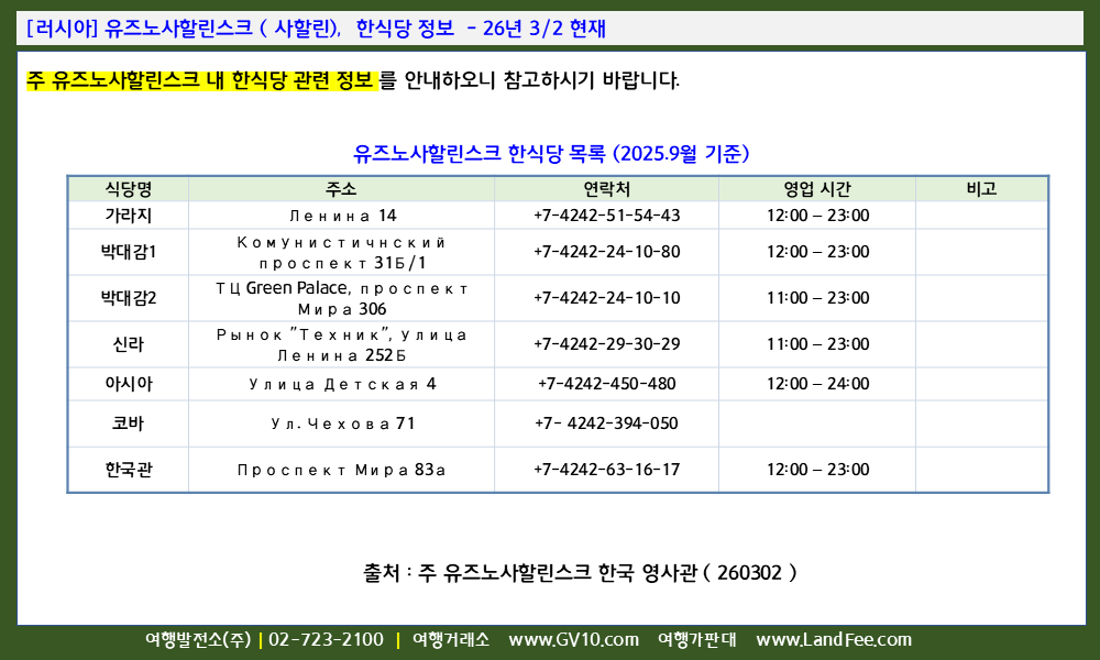[러시아] 유즈노사할린스크 ( 사할린), 한식당 정보 - 26년 3/2 현재