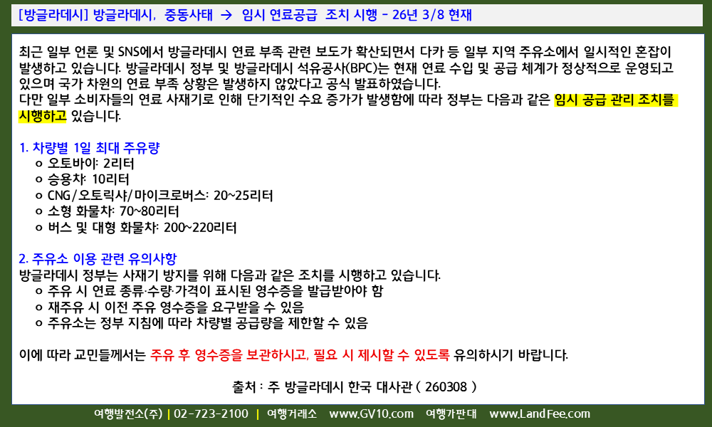 [방글라데시] 방글라데시, 중동사태 -> 임시 연료공급 조치 시행 - 26년 3/8 현재