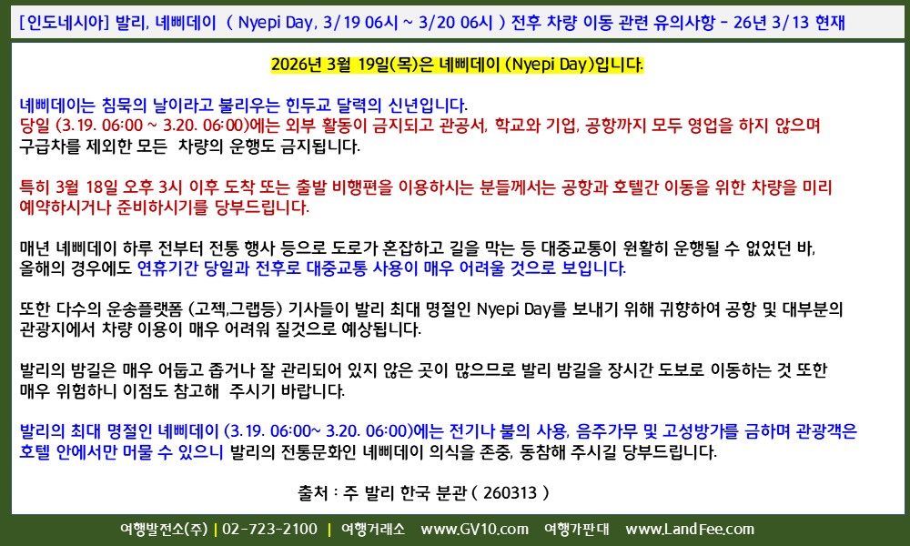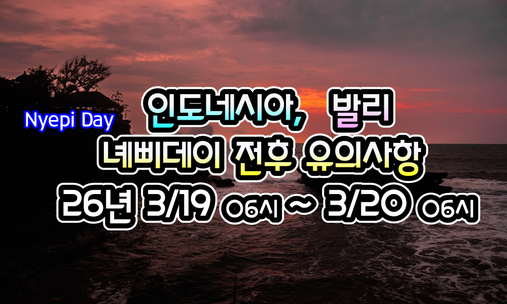 [인도네시아] 발리, 녜삐데이 ( Nyepi Day, 3/19 06시 ~ 3/20 06시 ) 전후 차량 이동 관련 유의사항 - 26년 3/13 현재