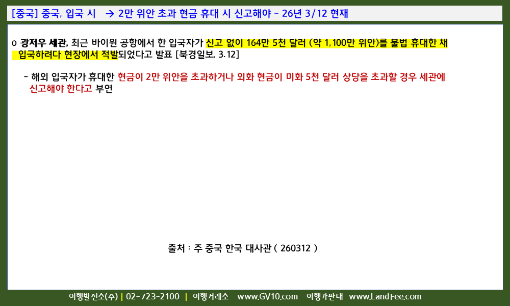 [중국] 중국, 입국 시 -> 2만 위안 초과 현금 휴대 시 신고해야 - 26년 3/12 현재