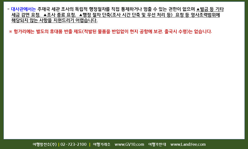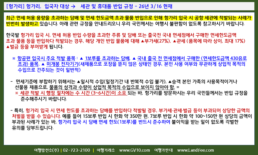 [헝가리] 헝가리, 입국자 대상 -> 세관 및 휴대품 반입 규정 - 26년 3/16 현재