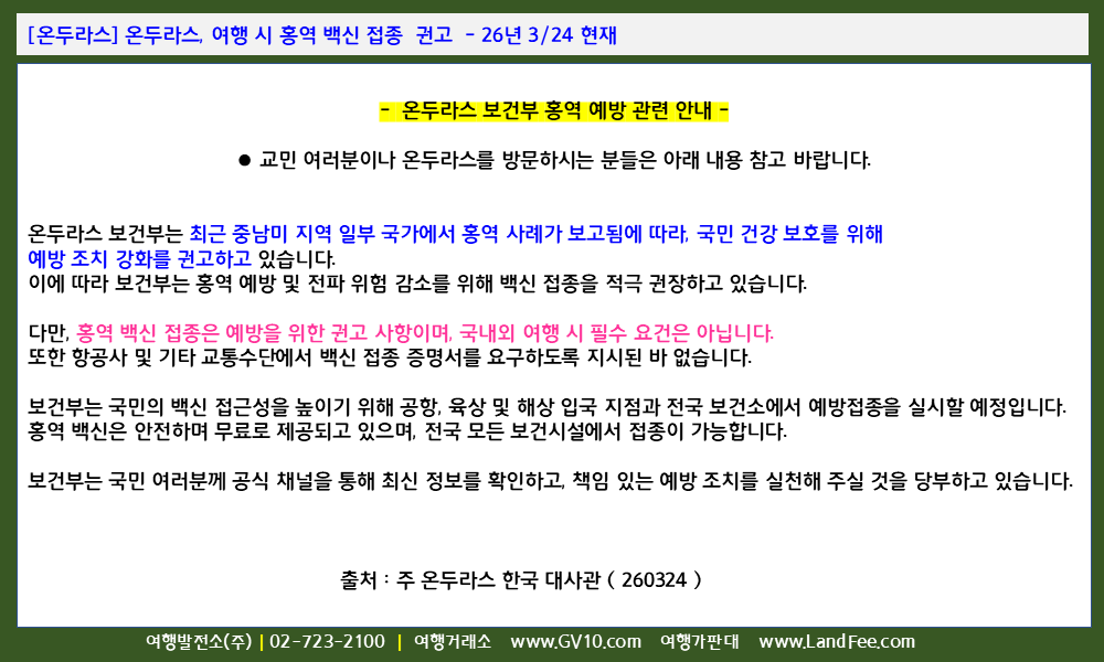[온두라스] 온두라스, 여행 시 홍역 백신 접종 권고 - 26년 3/24 현재