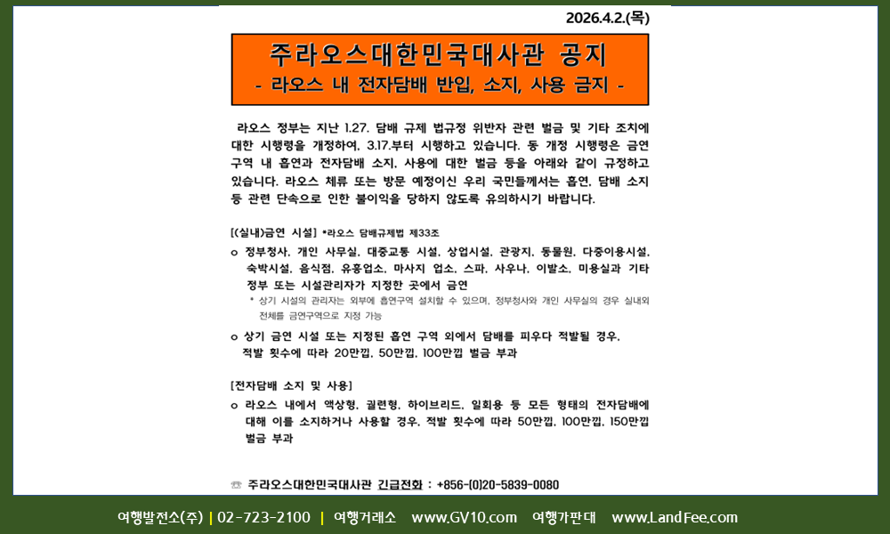[라오스] 라오스, 전자담배 반입, 소지, 사용 금지 - 26년 4/2 현재