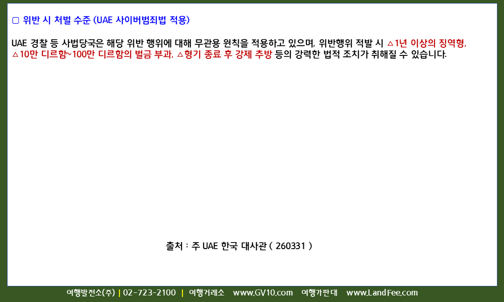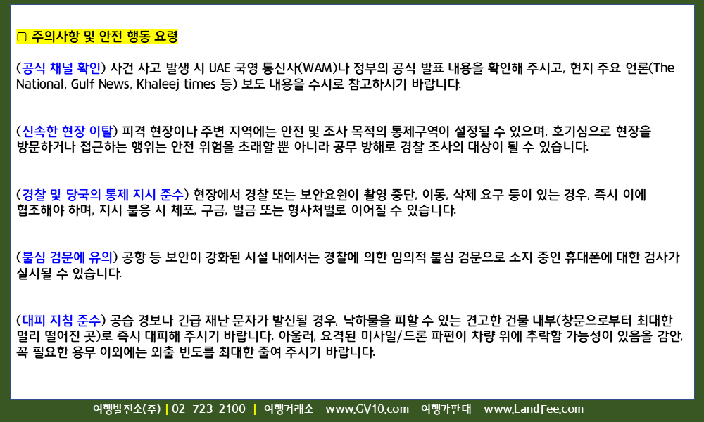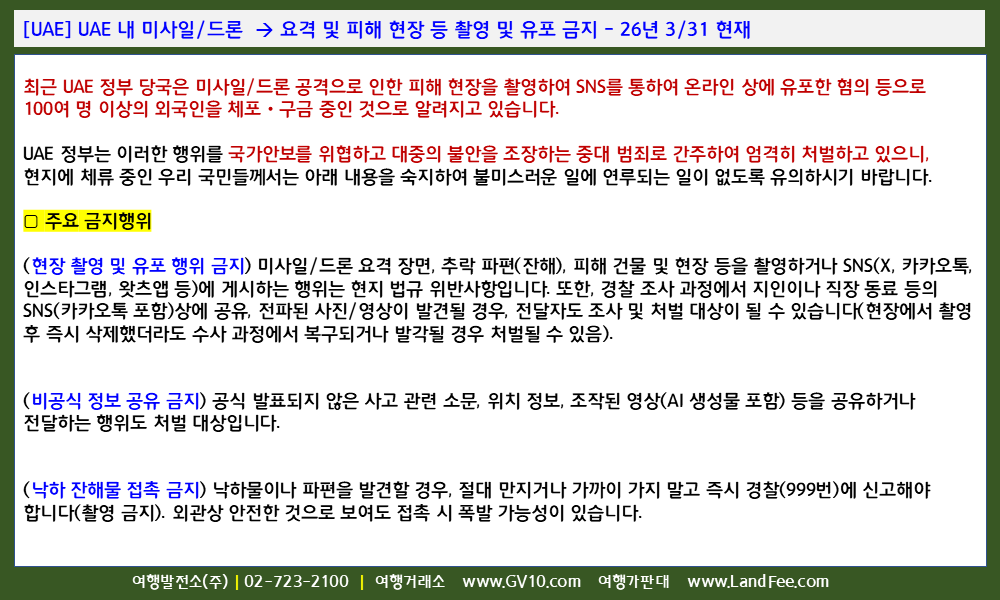 [UAE] UAE 내 미사일/드론 -> 요격 및 피해 현장 등 촬영 및 유포 금지 - 26년 3/31 현재