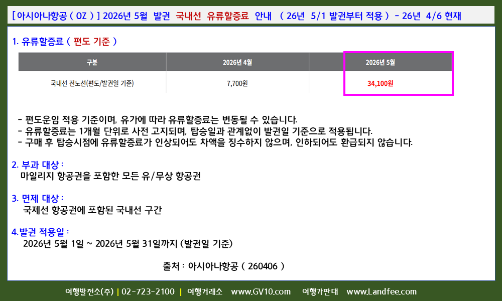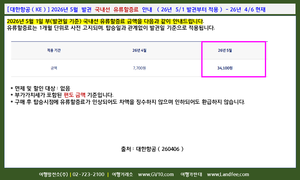 [대한항공/아시아나항공] 2026년 5월 발권 국내선 유류할증료 안내 ( 26년 5/1 발권부터 적용 ) - 26년 4/6 현재