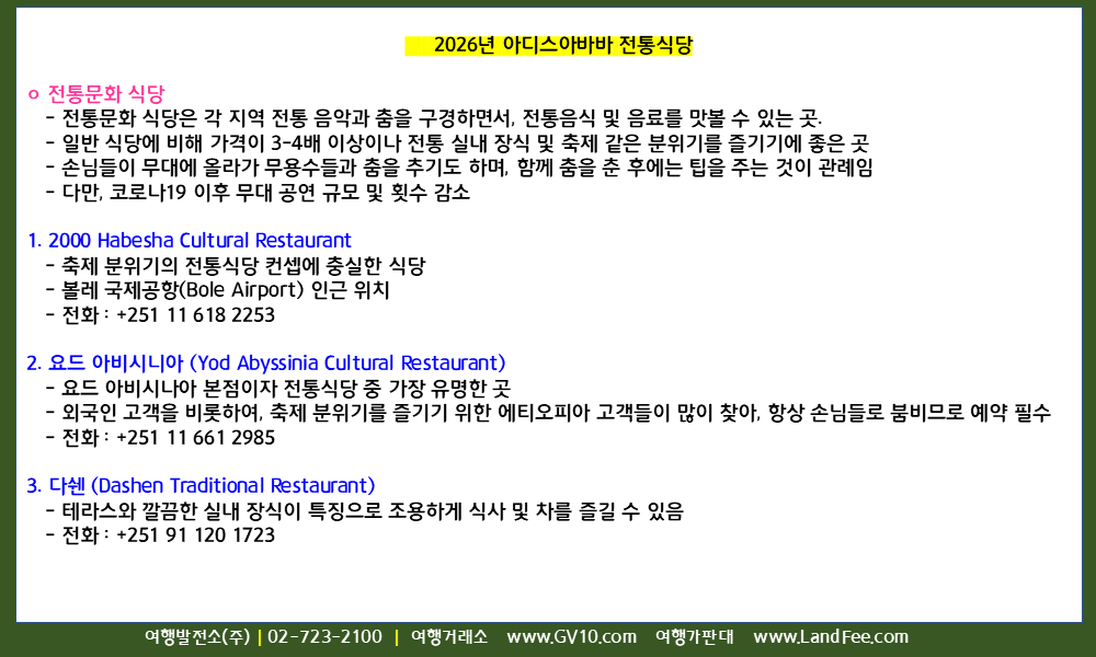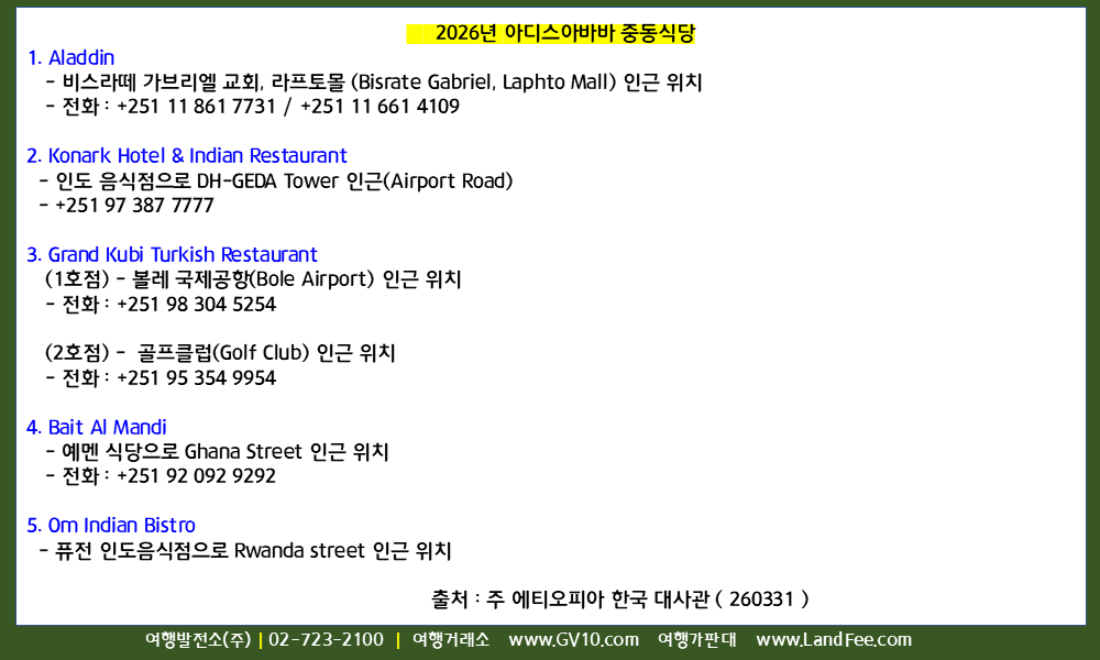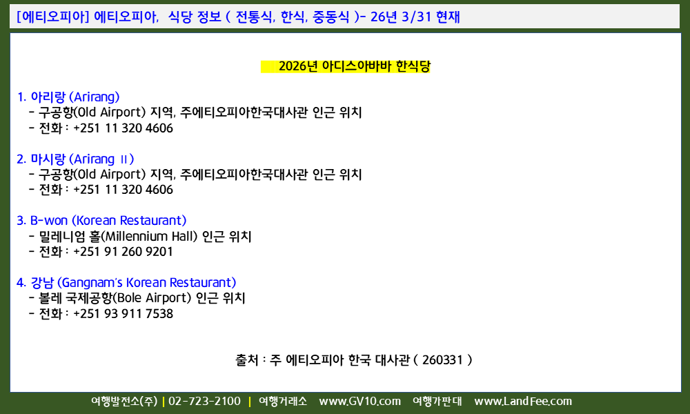 [에티오피아] 에티오피아, 식당 정보 ( 전통식, 한식, 중동식 )- 26년 3/31 현재