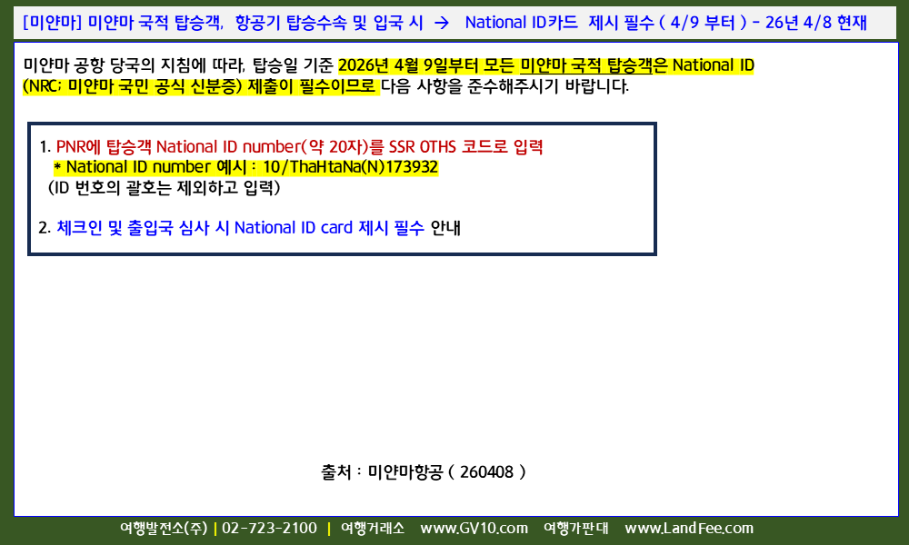 [미얀마] 미얀마 국적 탑승객, 항공기 탑승수속 및 입국 시 -> National ID카드 제시 필수 ( 4/9 부터 ) - 26년 4/8 현재