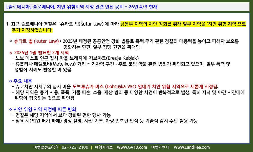 [슬로베니아] 슬로베니아, 치안 위험지역 지정 관련 안전 공지 - 26년 4/3 현재