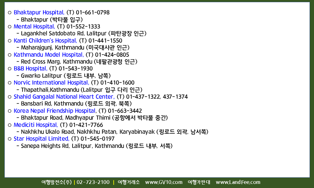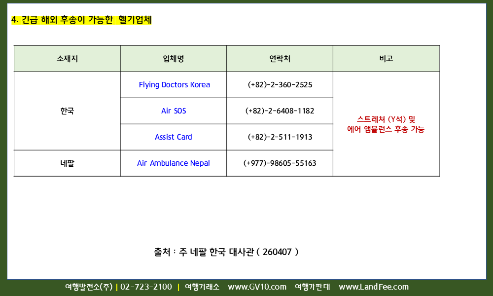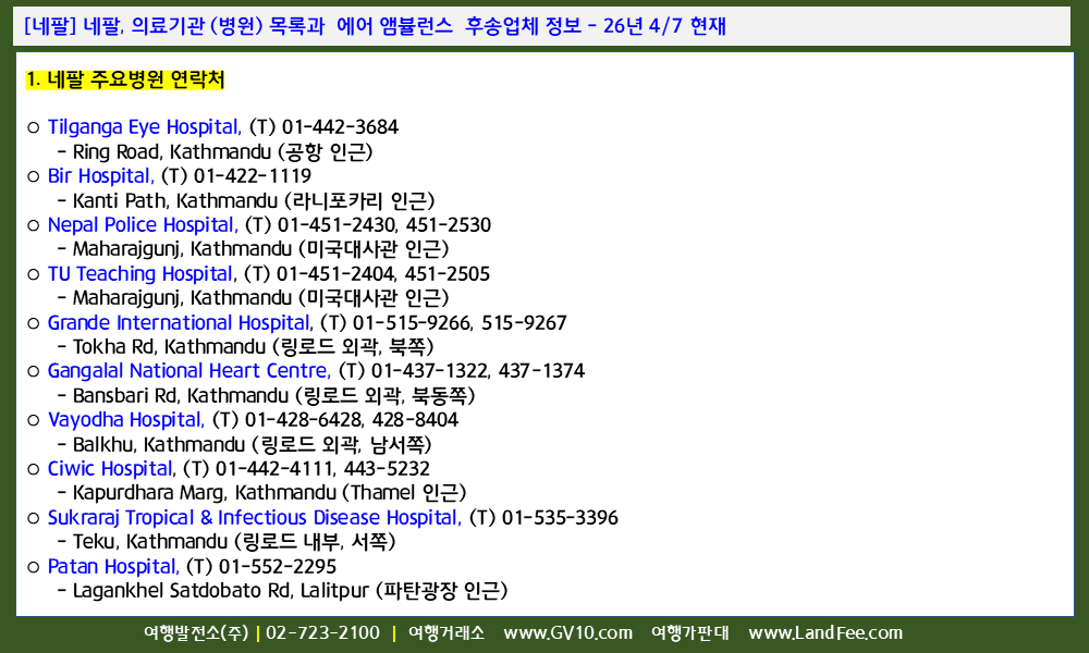 [네팔] 네팔, 의료기관 (병원) 목록과 에어 앰뷸런스 후송업체 정보 - 26년 4/7 현재
