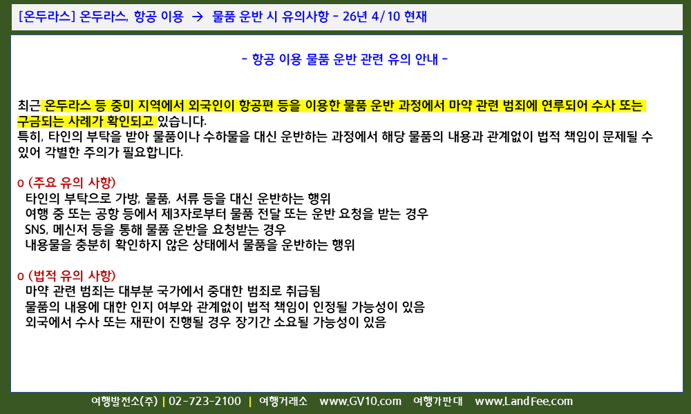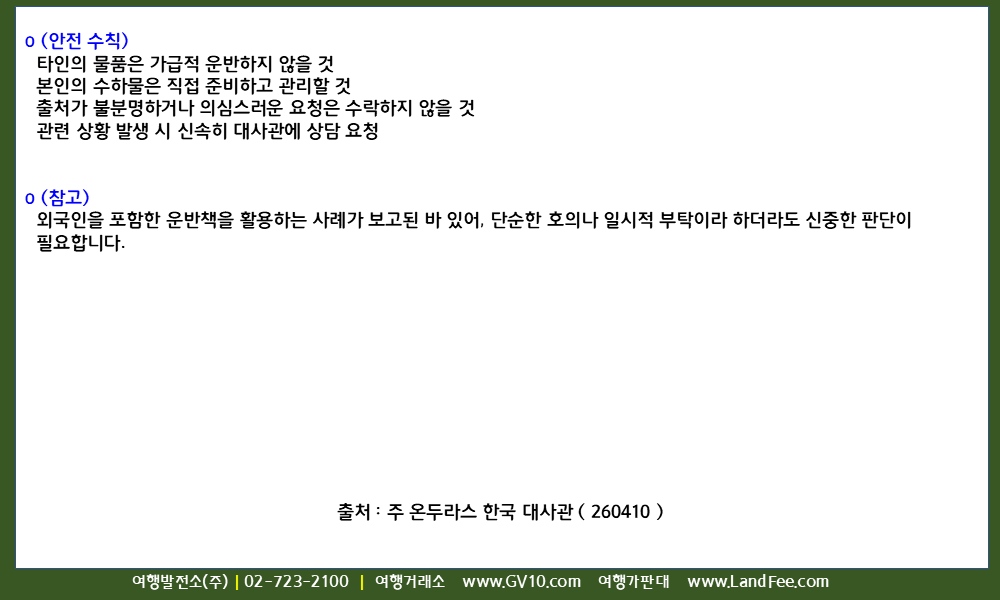 [온두라스] 온두라스, 항공 이용 -> 물품 운반 시 유의사항 - 26년 4/10 현재