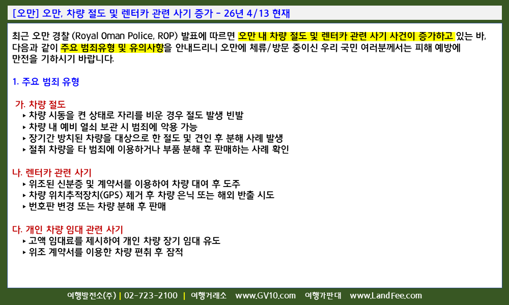 [오만] 오만, 차량 절도 및 렌터카 관련 사기 증가 - 26년 4/13 현재