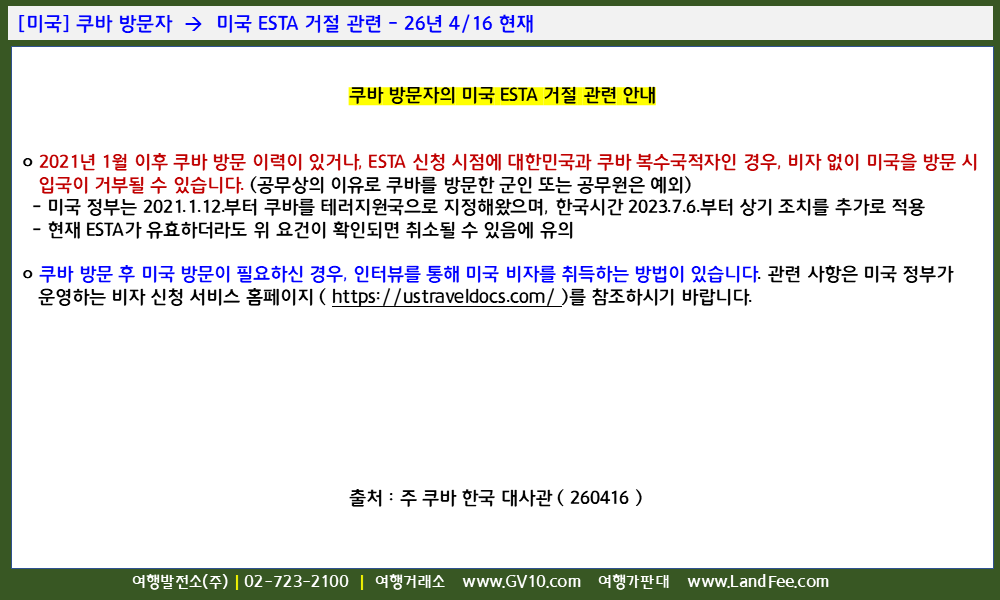 [미국] 쿠바 방문자 -> 미국 ESTA 거절 관련 - 26년 4/16 현재