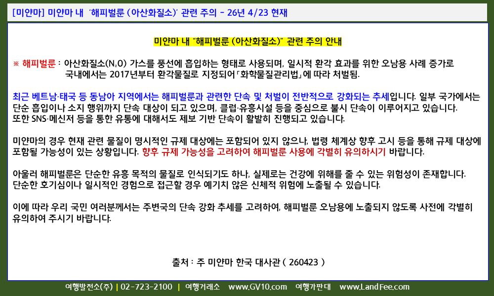 [미얀마] 미얀마 내 ‘해피벌룬 (아산화질소)’ 관련 주의 - 26년 4/23 현재
